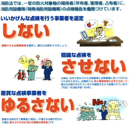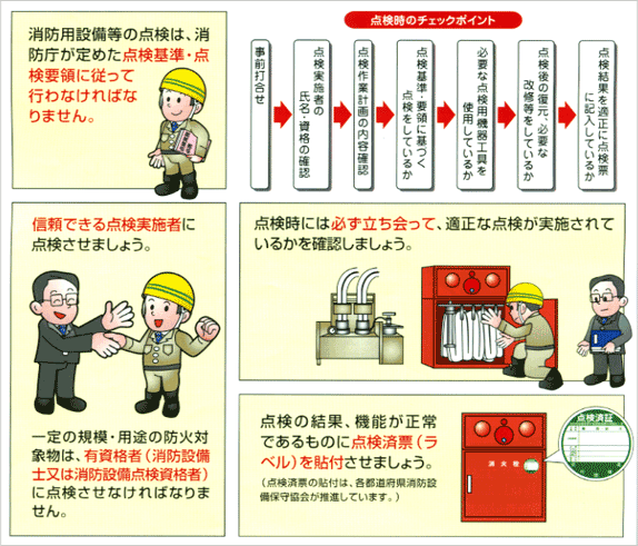 消防設備等の点検は、各消防用設備等の種類ごとに消防庁が定めている点検基準及び点検の要領に基づいて行うこととなっております。